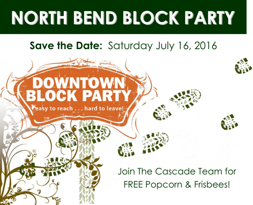 Join The Cascade Team for the North Bend Block Party! The Cascade Team Real Estate is proud to serve the North Bend community and we look forward to another great experience at this annual celebration of North Bend and all it's great residents and business partnerships that make it one of the most thriving communities in the Northwest! Come by to say hello and get your FREE popcorn and frisbee give-away - We'll be there from 10-6pm!