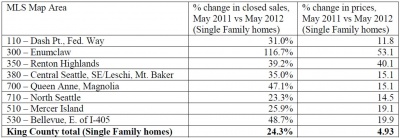Several areas scattered around King County reported double-digit gains in both the volume of closed sales of single family homes and the corresponding median selling prices. Those areas included: