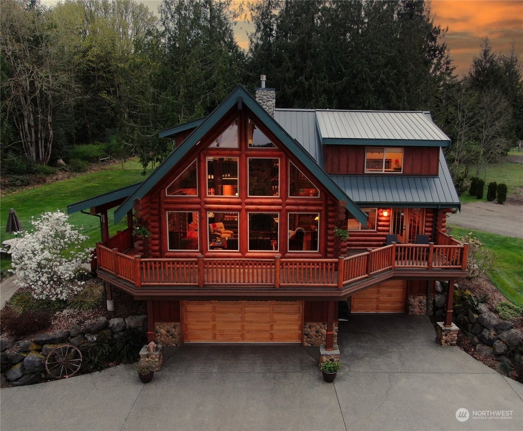 Discover peace & tranquility in this impeccably maintained Luxury Log Home Estate MINUTES from PORT TOWNSEND sited on 3.6 acres at the top of a hill, boasting breathtaking VIEWS of Chimacum Valley, PT Bay, Mt. Baker & the Cascades. Revel in the sunny vistas from the wrap-around Ipe deck, the Great Room, & the main floor primary suite. Rosewood flooring accents the dramatic fireplace. Vaulted ceilings w/skylights bathe the interior in natural light. The chef's kitchen is equipped with Viking appliances & custom cabinetry. The primary suite features a walk-in closet & an updated bathroom w/ a soaking tub & step-in shower. Radiant heating throughout the home. Close to PT, the Olympic Peninsula, Kitsap & 1.5 hours to Seattle.