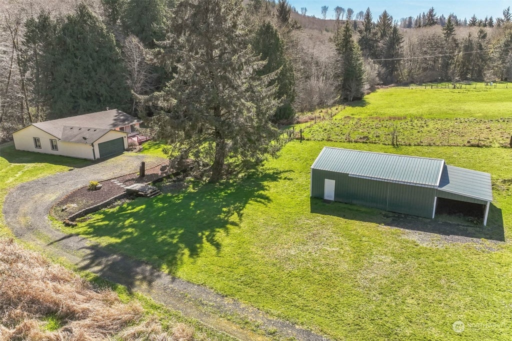 This beautifully situated 1900+ square foot rambler on TEN acres offers peace, privacy and many options for use! Spacious living area leads to primary suite featuring soaking tub, step in shower, and walk in closet. Kitchen is well configured w access to back deck overlooking a lovely very private yard area that leads down to Walker Creek, which flows through property-all situated on 10 acres of beautiful mowed land that borders State DNR property. Att garage w work benches/plenty of storage. RV sized 864 sf dry barn/shop w 288 sf added covered space. Septic and private well w carbon filtration system. THREE heat sources: mini split with AC, wall heaters and woodstove!
