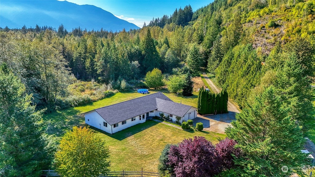 Welcome to your private mountain getaway where you can live full-time, seasonally, or as a short-term rental. Imagine your own gorgeous 20 acres with trails for walking, riding horses or ATVs. Inside the spacious custom home, it's ideal layout places all entertaining areas central, including living room, open kitchen with large island, dining room, & family room plus outdoor patio access. Primary bedroom with two walk-in closets has private bath & soaking tub. Three more bedrooms & hall bath. Stay comfy all year with energy efficient heat pump heating & cooling. The oversized 2-car garage enters to the kitchen with mudroom & half bath steps away. City of Darrington growth zone, just minutes to hiking trails, Whitehorse, Marblemount & more.