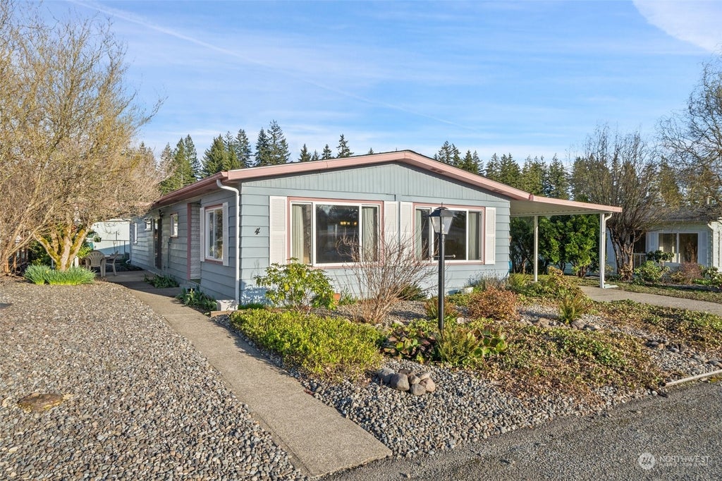 Christmas Village: a 55+ community manufactured home park close to shopping, hospital and services. This home is 1536 sq ft with an open living/dining/kitchen area. Primary bedroom has its own bathroom (with tub and separate shower), and a large closet. 2+ car carport with a shed/workshop on one side of the home, and a covered patio on the other side. Partially fenced yard with a cleared space for a vegetable garden, lots of trees and shrubs, still easy to maintain. Seller is offering a floor covering credit of $2500 for the 2 bedrooms. Christmas Village has a clubhouse and small community park, community space for RV storage.