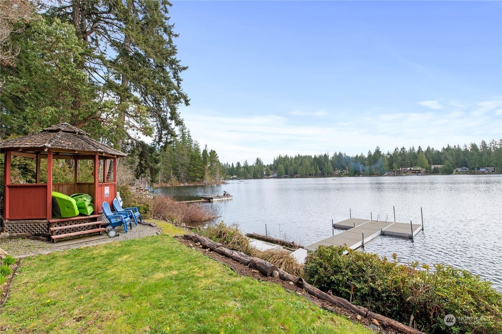 Located on the peaceful shores of Trails End Lake, this cozy getaway offers 75 feet of prime waterfront for easy lake access. Inside, you'll find charming Brazilian cherry hardwood floors paired with custom cabinetry, creating a welcoming atmosphere. With three bedrooms and one and three-quarter baths, there's plenty of room to relax. The high cathedral ceiling adds a touch of grandeur, while the large prow window lets in plenty of natural light and stunning views. Outside, enjoy amenities like RV parking with hookups, a deck, a private dock, a hot tub with beautiful scenery, a gazebo, and well-maintained landscaping. Fully furnished. Access to the Trails End Community Club. No HOA.