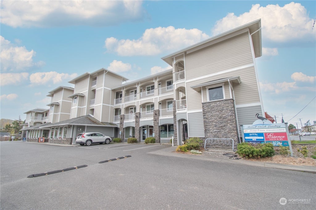 Experience breathtaking sunset vistas over Birch Bay from the exquisite Terrell Creek Landing condominiums! Securely nestled within a well-appointed building, this top-floor unit boasts convenient elevator access directly from the lobby. Step inside to discover an inviting open layout, highlighted by a gourmet kitchen adorned with granite countertops, a gas range, and stainless steel fridge. The kitchen effortlessly flows into a breakfast bar and a separate dining area, perfect for entertaining guests. Unwind in the cozy living room, complete with a gas fireplace, before stepping out onto the covered deck to savor the panoramic view. With two bedrooms and two full bathrooms, this residence offers both comfort and convenience. Just a leisure