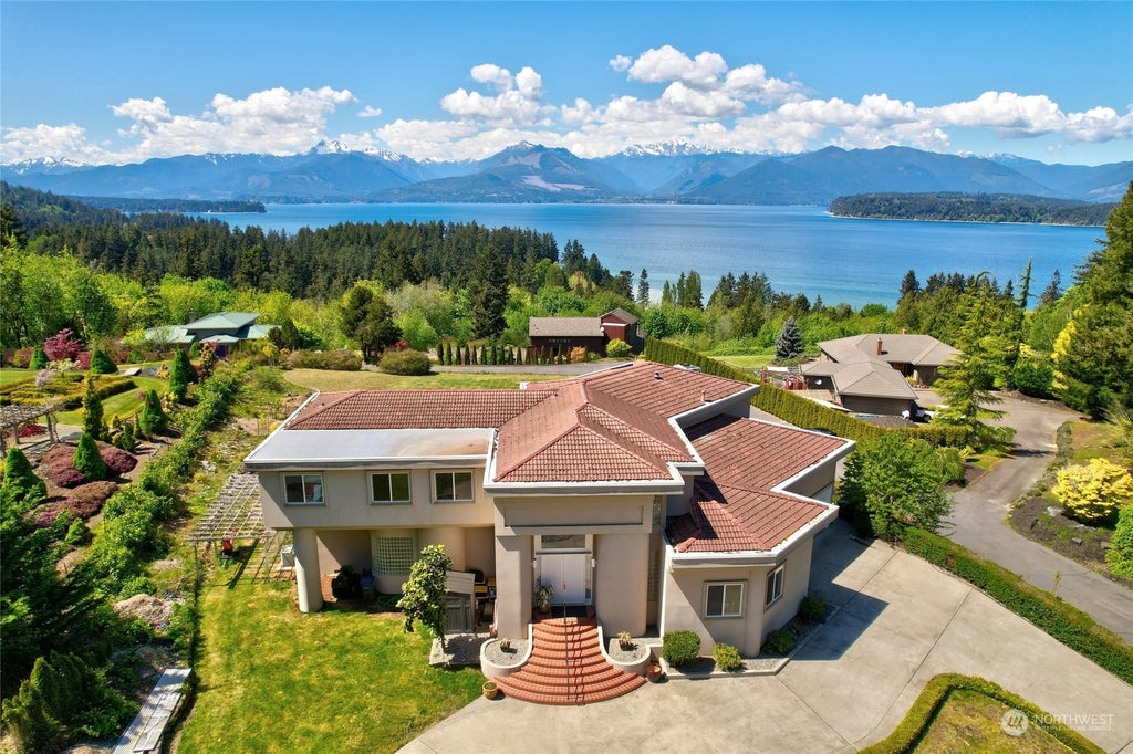 Absolutely captivating breathtaking views of Olympic Mountain & the sound from this stunning custom-built home! Upon entry, you see a dramatic vaulted ceiling, open floor plan to take in the fabulous views. Elegant living, dining, family room, custom lightings. Gourmet kitchen with slab granite countertops & customized cabinetry. Italian Carrara marble flooring throughout, expansive walls of windows offer abundant natural lights & views from sunrise to sunset. Primary suite boasts a spa, reading area, & private deck. Enjoy a fancy theatre room & central AC. 4 bedrooms upper level, plus a den & extra room with shower on main floor. With 2.36 acres, plenty of outdoor space for you enjoying the ultimate life of the Pacific Northwest.
