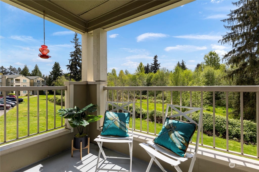 You'll be enchanted the moment you enter this home, thoughtfully updated throughout. Overlooking North Creek - the sounds of birdsong, the creek, and rustling trees give you a country calm while being conveniently located to abundant urban amenities; a quick jaunt to 405. New carpets, paint, and designer lighting elevate the space. This smart floorplan has open living spaces awash in natural light. A living room with a tasteful stone fireplace, proper dining room, and the kitchen with granite counters has an easy flow for entertaining. The primary bedroom easily accommodates a king bed & you have direct access to the bath. The second bedroom is also gracious. Amenities include gym, clubhouse & picnic area. A wise investment & fabulous home!
