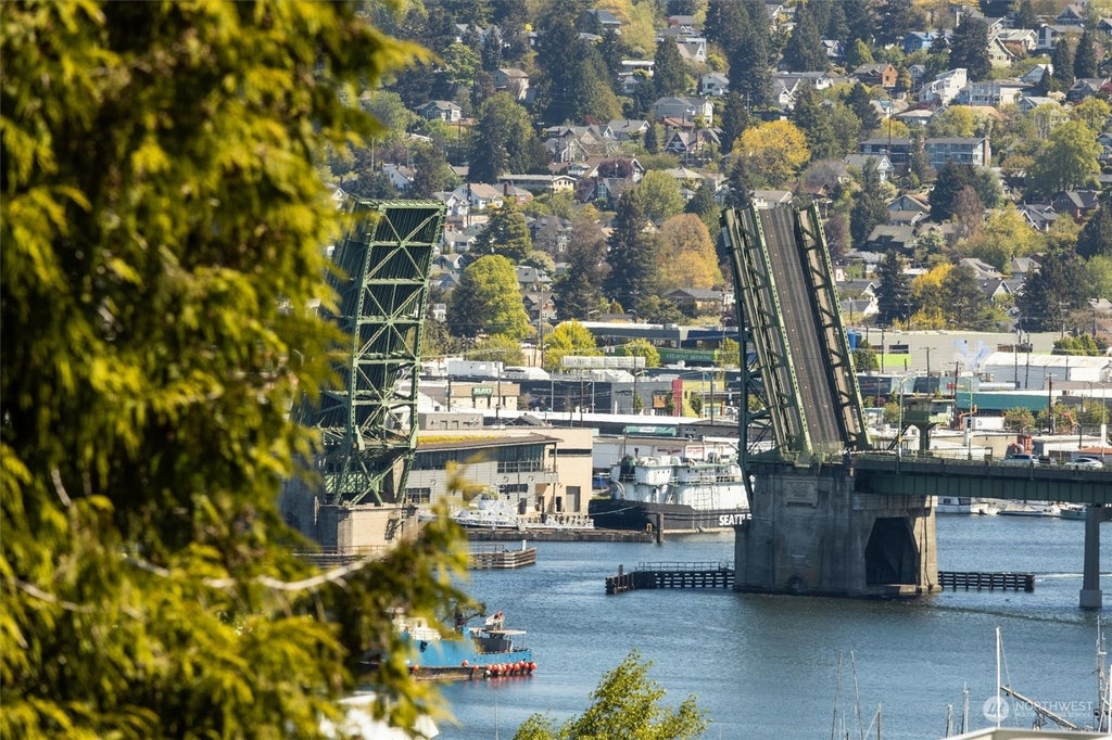 This top floor unit boasts views of the bay and Ballard Bridge; open floorplan with lots of natural light; designated parking spot in the secure garage; elevator access; & a beautifully updated kitchen with eating bar. This 1 bedroom, 1 bath condo offers washer & dryer in unit; LVP flooring; & storage closets, as well as private storage in the building's secure storage area. Spacious bedroom can easily accommodate a king size bed & the wall to wall closet offers plenty of room for all your clothes & shoes. No Rental Cap!
