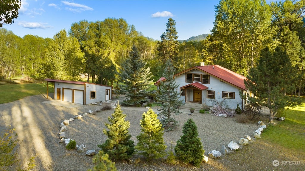 A hidden gem! Located down a private drive, this custom-built home graces 3.42 acres of meticulously maintained property. The main level highlights include two primary bedrooms with ensuites and private patios. The main floor is adorned with Brazilian cherry wood flooring, a stunning great room with stone fireplace, minimalist kitchen, dining area, sunroom and an additional full guest bath. Upstairs, you will find the third bedroom, half bath and bonus living room. Outside, the grounds have been thoughtfully planned and designed. Enjoy the mature gardens, fruit trees, multiple sitting areas and two fire pits. The detached 2 car garage w/carport includes space for storage or workshop. Welcome to your own private oasis just outside of town.
