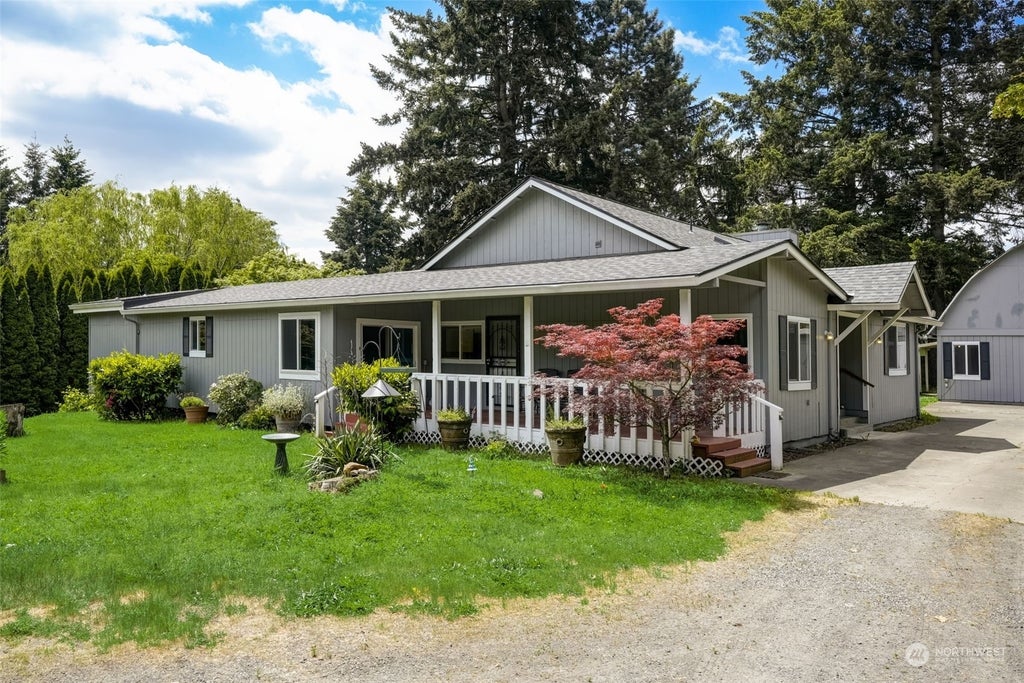This property blends comfort and style amidst serene surroundings. A gated driveway leads to a welcoming covered front deck. A wood-burning fireplace, skylight, and vaulted ceilings adorn the great room, complemented by hardwood floors. The gourmet island kitchen boasts stainless appliances and ample cabinetry, flowing into a dining area with deck access. Primary en-suite features a walk-in closet and deck access, with a combo jet tub and shower. Additional bedrooms offer versatility, a laundry/utility room adds convenience. Newer appliances and smart home features. Covered decks provide relaxation spots. A chicken coop, barn-style garage with an office, and lush landscape with mature trees and fruit plants, offering a charming lifestyle.