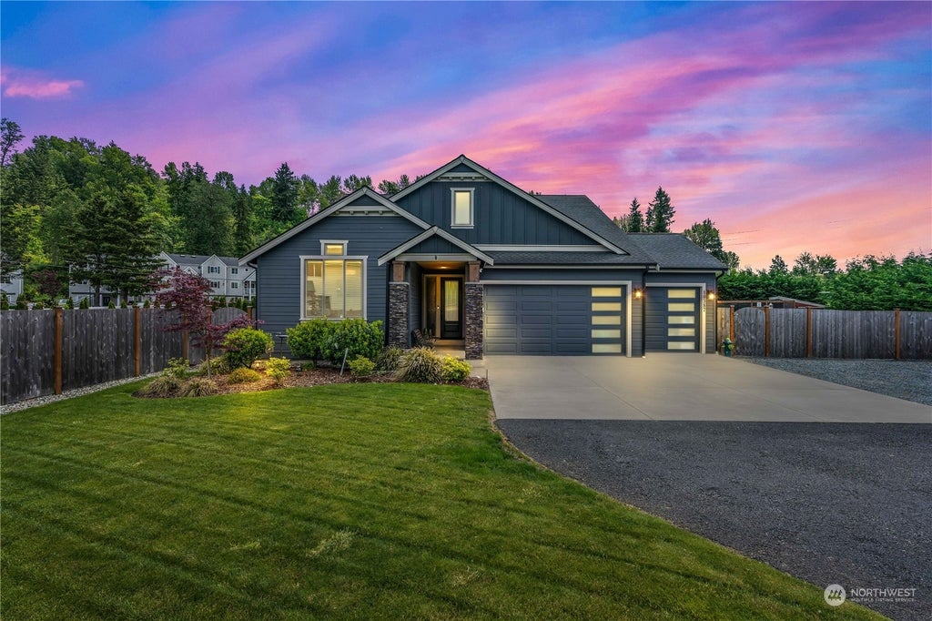 Welcome Home to this Beautiful Home located on over a half-acre lot, that lives like a Rambler featuring your Primary Bedroom, Laundry & main living spaces on the Main Floor, along with Two additional Bedrooms & Guest Bath, perfect for a potential Multi-Generational set-up. Upstairs you will find an Additional Bedroom, Guest Bathroom & Large Bonus Room with endless possibilities. Situated back on a private road, there is ample parking space, room for RV parking or possibly build your dream detached shop. Entertain your Guests in the large, expansive landscaped yard with Sprinklers & Irrigation throughout, Storage Shed & your very own Chicken Coop! NO HOA, Custom Hunter Douglas Blinds, Tesla Charger, Close to the Sounder Transit & more!