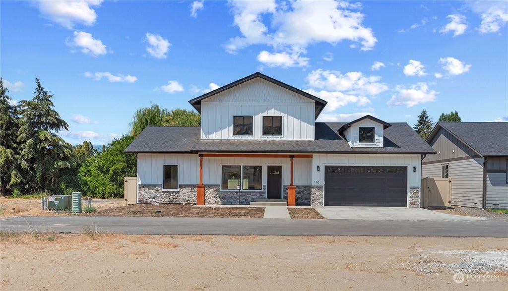 This charming new two-story with shake and stone finishes offers luxury and convenience. Brought to you by Trinity Builders. It features 9-foot ceilings, beam accents, luxury vinyl plank flooring and large picture windows. The kitchen includes a large island, quartz countertops, stainless steel appliances, a walk-in pantry and a convenient pot filler. The open and spacious great room provides lots of options for furniture placement. The primary suite offers a step-in tile shower, quartz counters, dual sinks, and a large walk-in closet. Upstairs, there are two bedrooms, a bathroom, and a bonus room. The back patio is perfect for entertaining, with a completely fenced backyard. The home is centrally located and offers serene mountain views.