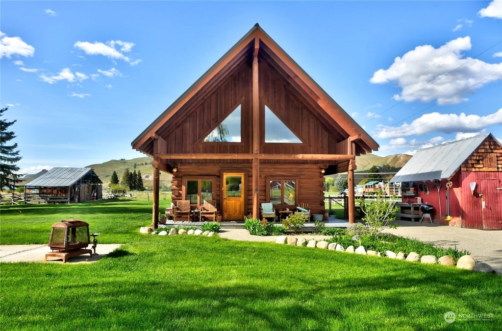 Embrace the quintessential country living experience! This incredible 2-bdrm, 2-ba 1500 sqft log home sits on 2 sunny acres, offering a serene & picturesque setting. The vaulted ceilings & open floorplan create a spacious & inviting atmosphere, while the tasteful kitchen features granite countertops and stainless steel appliances. The main level includes a bedroom & 3/4 bath, while the large loft bedroom upstairs is accompanied by a full bath. The home is equipped with new ductless mini splits. The property boasts 2 outbuildings and a rustic barn. The green yard and breathtaking mountain views add to the charm of this property. Includes two tax parcels, ensuring ample space, privacy, and room for future development, just 2 miles from Twisp.