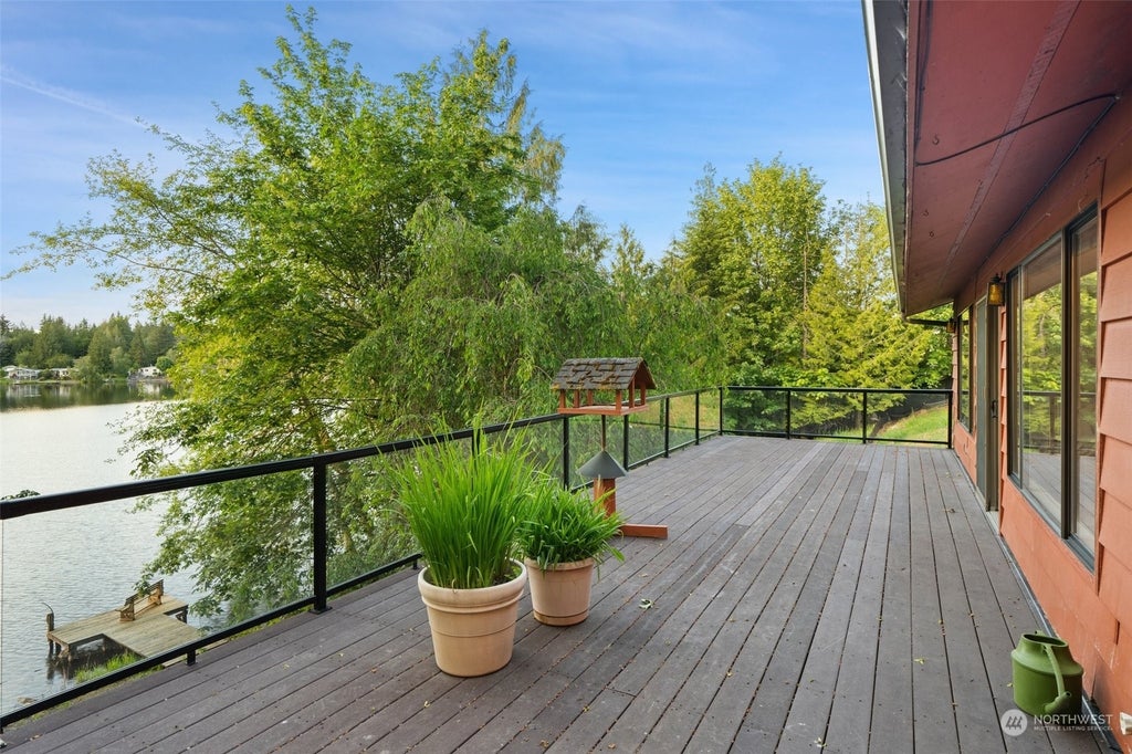New roof and flooring just installed. This hidden gem sits quietly on beautiful Fawn Lake in a secure gated community. 60' of waterfront, 1,940 sf home has a fully updated kitchen with quartz countertop. The main bedroom has an oak floor, walk-in closet & large bathroom. Open concept main floor with large windows allows immersion in nature with wildlife such as otters, deer & eagles. Extra space in finished basement. Large deck overlooking the private dock. Cedar siding. Landscaping includes rhododendrons & native ferns. Room to park/plug in RV next to well-crafted shed. Fawn Lake has parks, swimming, stocked fishing, tennis & basketball courts. Quiet: no gas motors on lake. Access in gate by a Licensed Real Estate Broker.