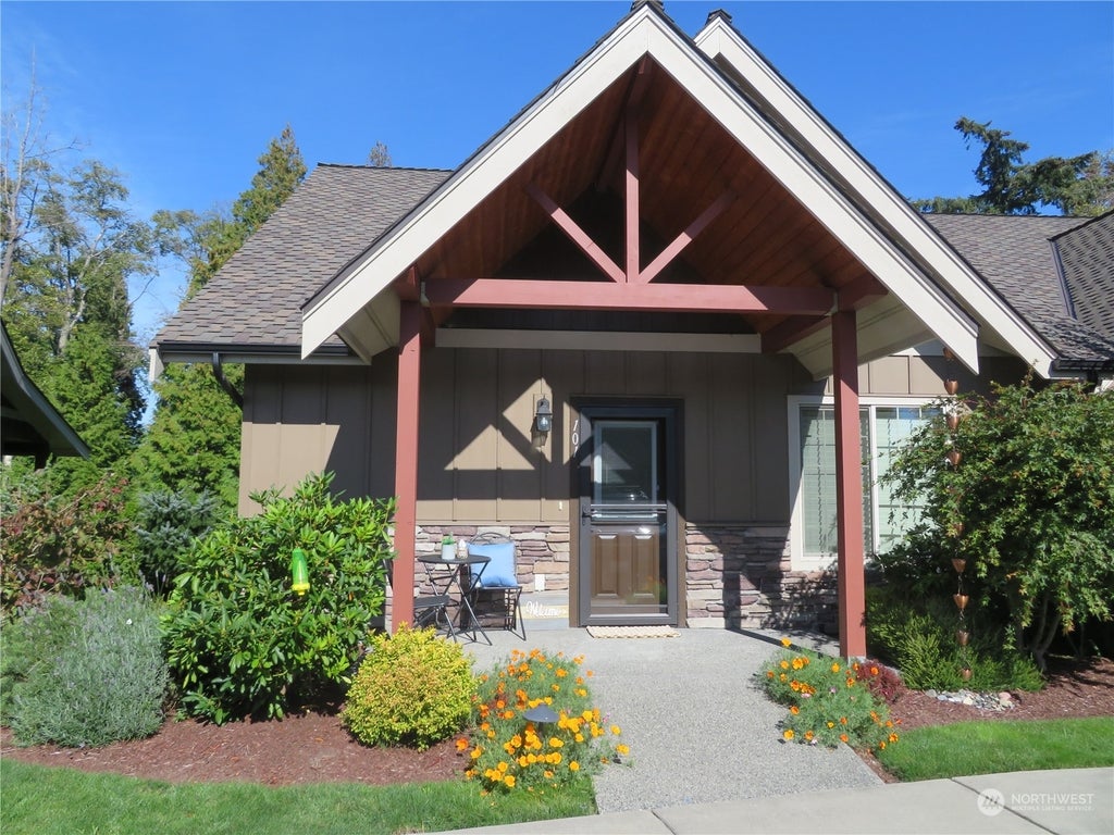 Birch Bay craftsman cottage style 2-story townhome end unit, The Tides at Birch Bay: sunny south-facing garden patio in front, back deck facing forested back yard. Private feel. Lushly landscaped community w/ outdoor pool & clubhouse less than 5 minutes to the Beach. Bay & spectacular sunsets visible from front community grass field. Well designed and stylish exterior cement plank siding, wood & stonework. Interior w/ great quartzite counters, rock surrounded fireplace, stainless appliances, vaulted ceiling & skylight. 1,156 SF, 2 BR. Full BA, 3/4 BA & 1/2 BA. Loft area can be an office. Paneled back deck overlooks, yard & trees sloping down to a creek. Storage off of deck. Near the seaside fun of Birch Bay beaches, restaurants and more!