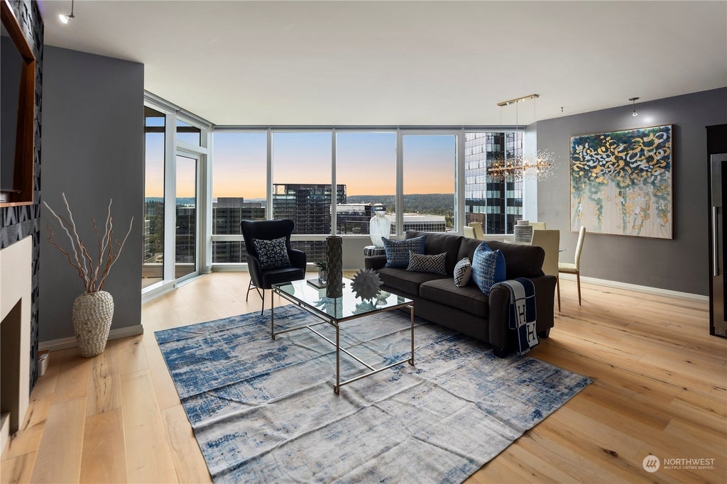 Experience the pinnacle of luxury living in this Bellevue Towers sub-penthouse. This 2-bedroom, 2.25-bathroom unit with a bonus room features high-quality craftsmanship and a wall of windows that showcase stunning city and lake views. The home boasts 9' ceilings, a chef's kitchen equipped with Sub-Zero and Wolf appliances, and custom cabinetry. Included are two parking spaces and extra-large storage. Enjoy premium building amenities like fitness rooms, a whirlpool spa, dining room, community theater, outdoor terraces, and 24-hour concierge. Perfectly located in downtown Bellevue, close to Bellevue Square’s top shops and restaurants.