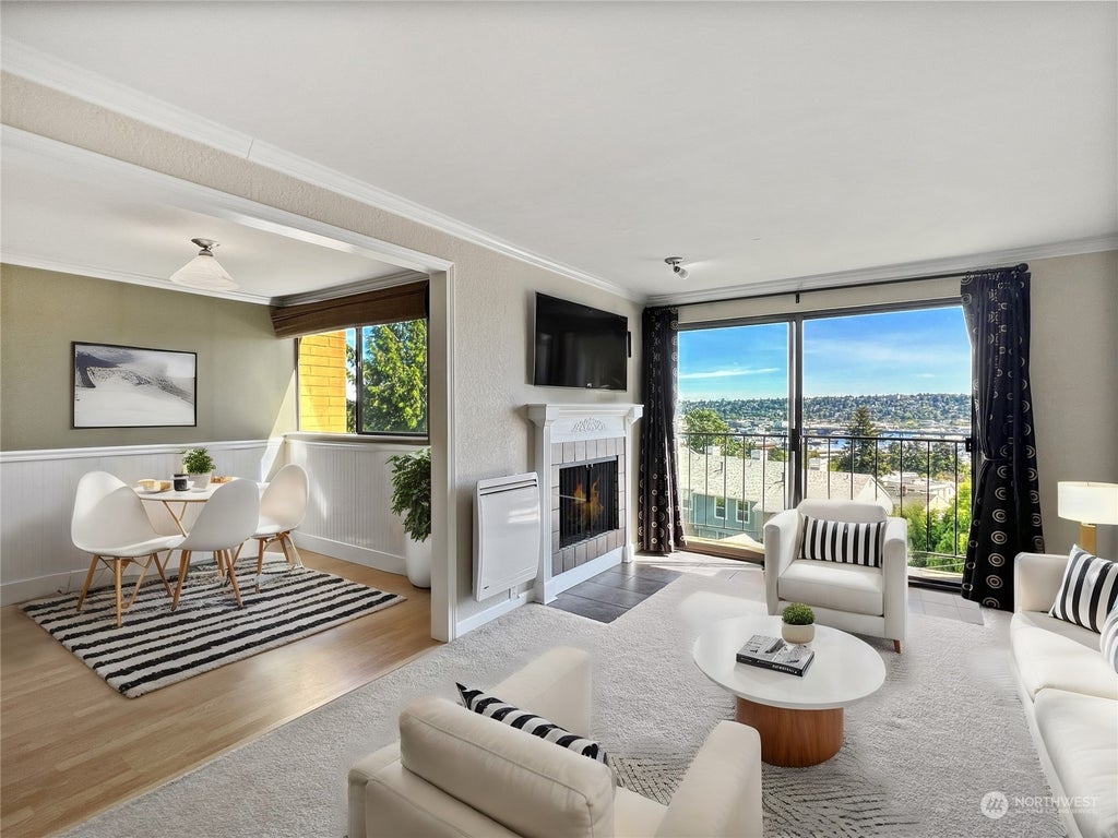 Nestled in the heart of the coveted Magnolia neighborhood in Seattle, WA. – the top-floor unit offers unparalleled tranquility in an impeccably maintained building—panoramic eastern views of the canal, bridges, and vibrant Seattle neighborhoods beyond. The living room, complete with stunning views and a cozy fireplace, provides ample space for relaxation and even includes an alcove perfect for an at-home office. The primary bedroom features sliders to a charming Juliet balcony, inviting you to unwind. The fresh, updated kitchen with an adjacent dining area makes entertaining a delight. Abundant storage, in-unit washer and dryer, and convenient elevator access to the garage parking. The condo photos are virtually staged.