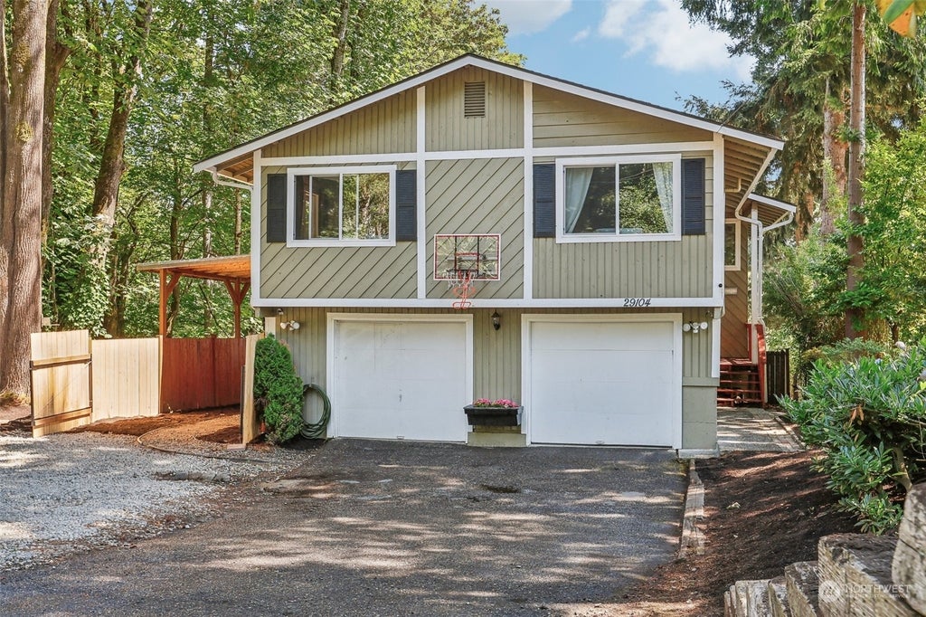 Welcome to this private & serene home, tucked away with a wooded gully & stream on over 1/2 an acre! This move-in ready home (with A/C!) has been updated throughout! Main floor features high ceilings & open concept living space, w/ a completely updated kitchen. Granite counters, newer cabinetry & all appliances included! Dining & living room are spacious, w/cozy wood fireplace & access to the updated deck! Down the hall, find 3 bedrooms, including primary suite w/full bath and WIC! Lower level features a family room w/wood fireplace, huge laundry, bath and a room w/ a closet! Access the hot tub via this room, as well! Garage is oversized. BONUS: covered & gated RV parking! Possibility of connecting to sewer, as well!