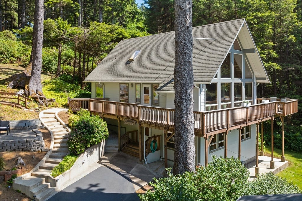 Incredible privacy at the beach! This ocean-view 4 bed, 3+ bath home has everything you need in a PNW beach getaway. Enter the main floor to find a vaulted, custom ceilings in the living room and brand new kitchen w/ top end appliances. 3 bedrooms, including one of the primary bedrooms, on main floor. Upstairs you'll find primary-bed loft outfitted with additional living space, large primary w/ renovated 3/4 bath. Downstairs is huge rec room that leads to wet bar, infrared sauna and laundry/storage area. Outside you'll find a new detached 2-car garage with ample storage alongside custom patio + fire pit, wraparound deck with hot tub and storage building. Private community trails provide access to miles of walkable beach!