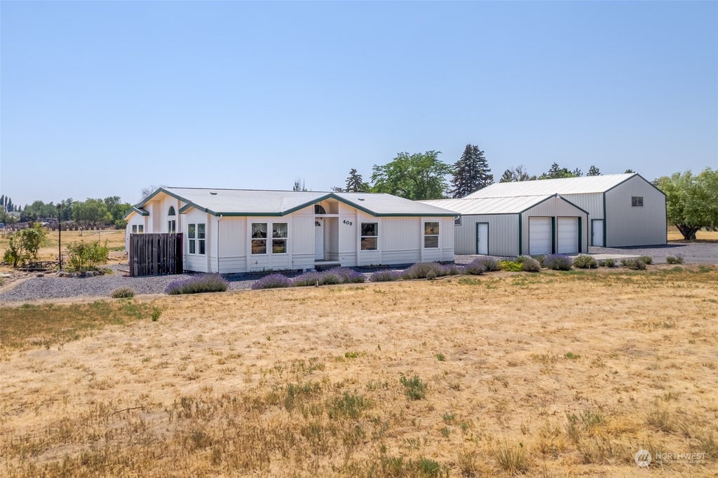 Great 3 bedroom 2 bathroom home on 5 acres! This property offers the perfect blend of comfort and space. Large primary suite with corner tub, double sinks and large vanity. 2 living spacious rooms and the laundry room off the back porch for convenience. Featuring 2 detached units, a double gar garage approximately 1440 square feet with automatic doors and large work area separated. Huge RV shop with gravel flooring, 3 bays and doors for parking and loft storage! Wonderful zero scape landscaping. Plenty of garden space, greenhouse and storage sheds. This is an outdoor paradise.