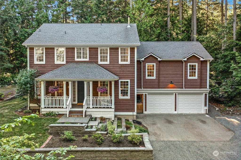 A Northwest classic with natural cedar siding on a private .79 acre lot with 1/4 share in 2 acres of protected open space/greenbelt. Roomy 2,470 sq ft floor plan with newly refinished hardwood floors on the main level and fresh paint inside. Tall 9.5/10' ceilings. Open-concept kitchen with granite counters, shaker cabinets, modern stainless steel appliances. Living room with cozy wood stove, a large upstairs bonus room and a family room with French doors that lead directly out to the large back deck and private yard. Oversized 2-car garage plus two flexible storage sheds and ample parking. Close to Gazzam Lake Trails, town and schools. A wonderful island package.