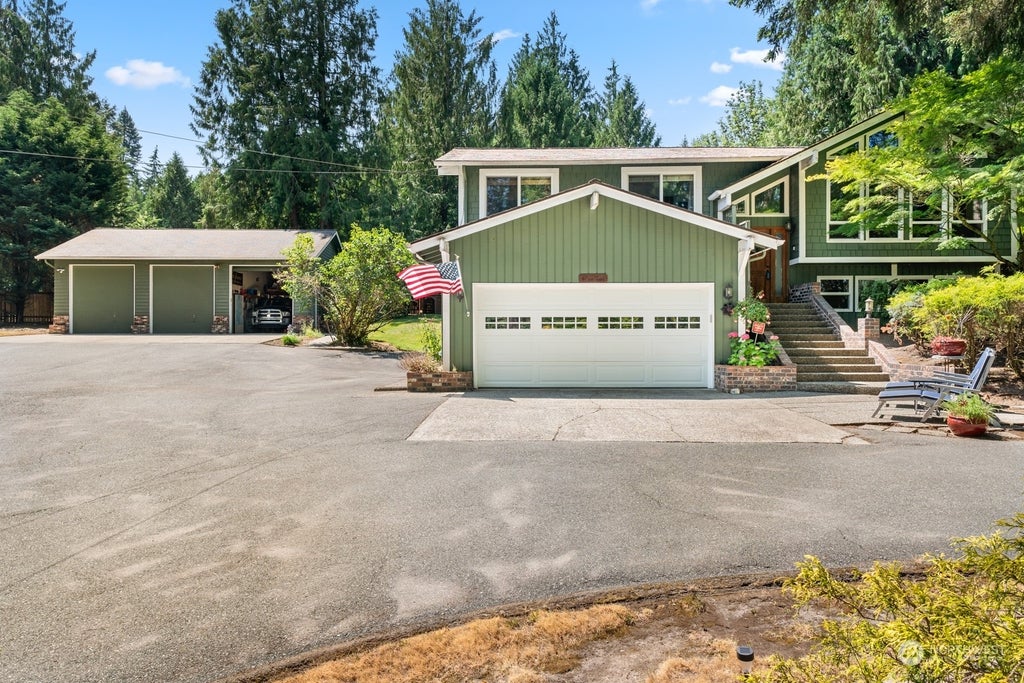 Private tree lined shy acre in the Hollywood Hill area. This one family estate with circular drive has something for everyone. The upstairs (3 bed 2 bath) is ready for your custom upgrades. Downstairs is completely updated with designer touches w/ 1 bed, ¾ bath, living room and wet bar. Perfect for entertaining and multi-generational living. The outside has it all. 3 RV bay detached garage/shop (+/- 1620 sq ft) with room for all your vehicles, toys + 20x10' attached storage. Multiple areas to enjoy relaxing in your mature landscaped yard (patios, deck & gazebo), you’ll never run out of space to entertain. Close to all Woodinville Winery District has to offer. BONUS: generator, air compressor, riding lawn mower Inc