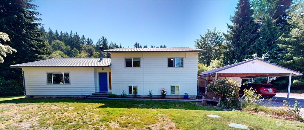 Great floorplan with 3+ bedrooms & 2.5 baths. Good size living room with pellet stove opening to a large dining area. Kitchen has plenty of counter space & storage plus newer appliances. Mini-split in living room and all bedrooms! What a great feature! New carpet and paint upstairs and new carpet on main floor. Basement has exterior door & could easily be an ADU area. Basement finished versus non finished Sq Ft is an estimate. Buyer to verify. You will love this beautiful one acre setting with 20 X 24 shop and greenhouse. Apples, pears, plums & blueberries too! Back patio with hot tub provides a private oasis for relaxation. Exterior of home freshly painted. Motivated seller. Bring offers!
