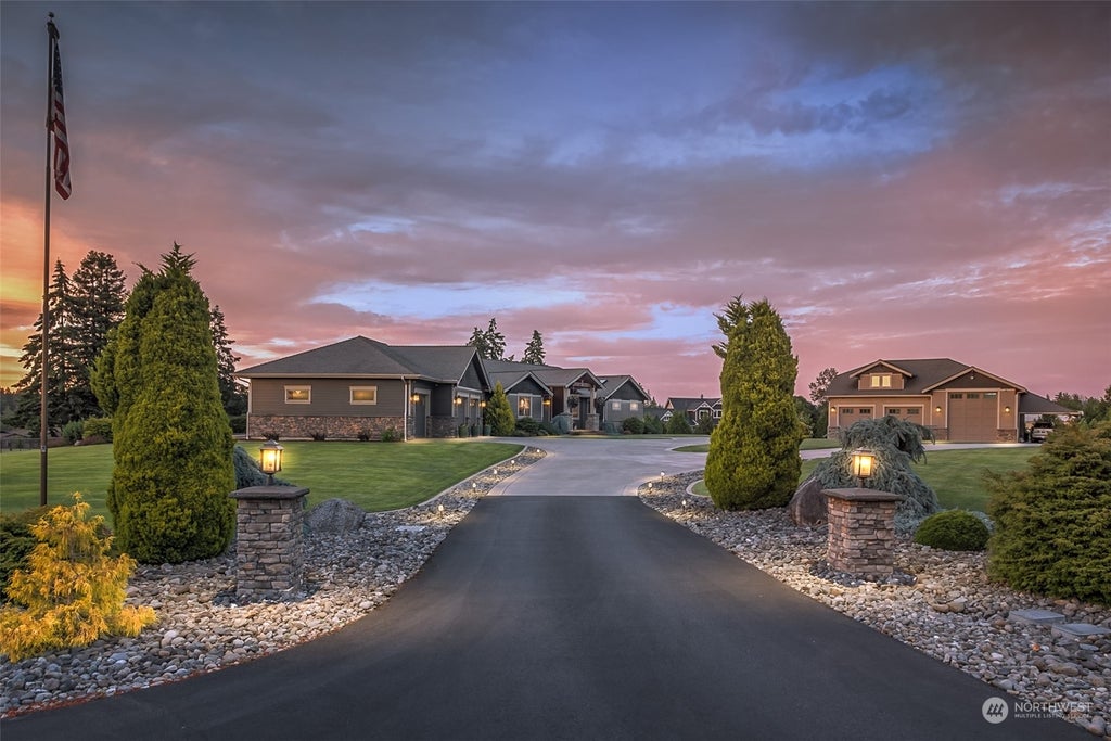Gorgeous daylight basement rambler & massive detached shop, perfectly positioned upon 3.5 manicured acres. Combining the detail of a luxury craftsman with the charm of a nature-inspired lodge, the bespoke interior boasts extensive hickory flring, lofty ceilings, dog parlor, dual home offices, & a gourmet entertainer's kitchen. The inviting primary bdrm is completed with a stone wrapped frplc, vaulted ceiling w/timber accents, deck access, sunlit walk-in wardrobe, & luxurious en-suite. Immense basement includes a sports viewing area, wet bar, rec room, gym, wine cellar, & indoor spa pool. Enviable gated entrance, garaging, landscape, & outdoor living.