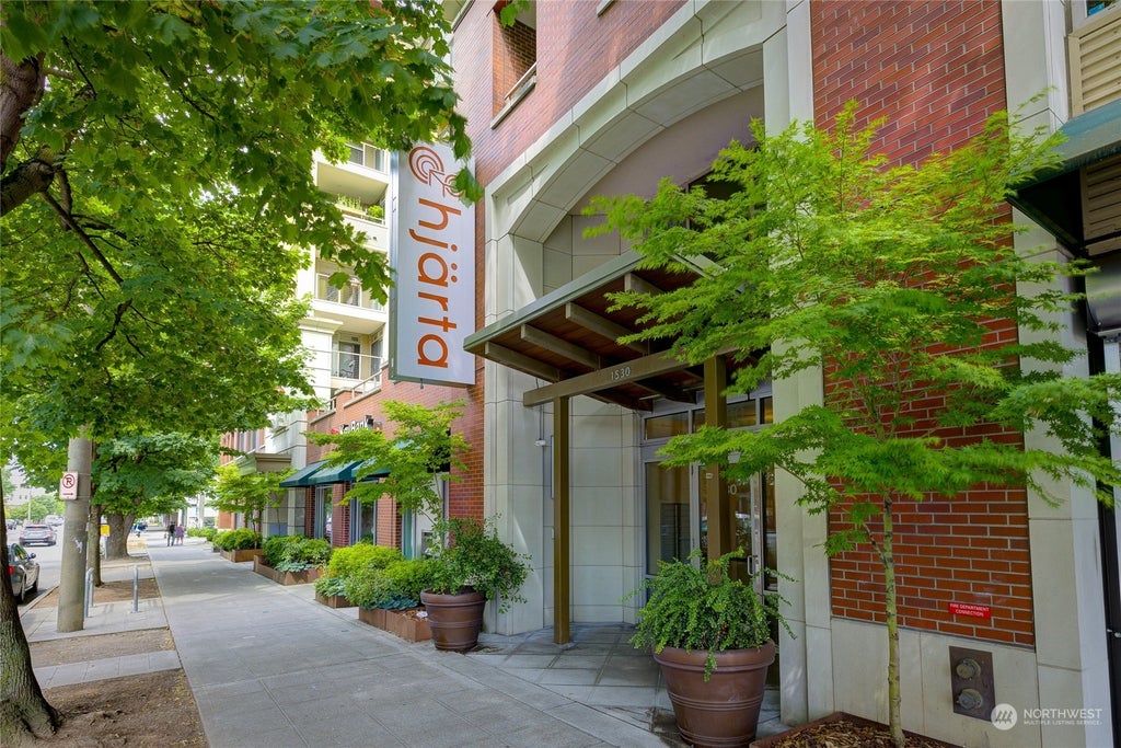 Hjarta, a contemporary green-built condo that is close to everything you're looking for in the Ballard lifestyle! Dining, breweries, shops, music, Ballard Farmer’s Market, Golden Gardens, Burke-Gilman Trail! Beautiful, bright, pet friendly open concept living with updated floors, fireplace, chef’s kitchen w/bar, gas range, SS appliances, quartz counters and in-unit laundry. Large bedroom with lots of closet space plus outdoor deck. Enjoy spectacular views from the rooftop deck w/spaces to entertain, relax, garden, and BBQ. Rare 2 great parking stalls, 1 includes power w/option for car charger, + large storage unit. Community lounge has a pool table, terrace, fitness/yoga rooms, & library. Strong HOA with low dues. Walk Score 98 & Bike 97.