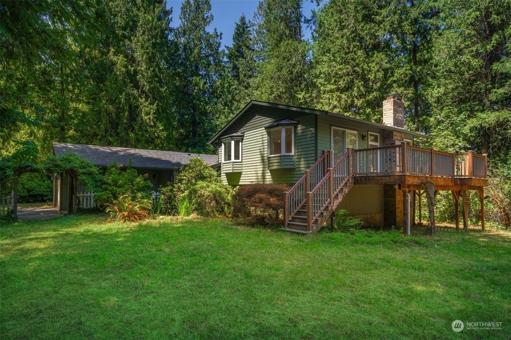 Beautiful tri-level home located on a secluded hilltop just a short drive from downtown Yelm, offering the convenience of all city amenities. This 3 bed, 2.25 bath home features a spacious and well-thought-out floor plan. The open kitchen boasts elegant quartz countertops and new cabinets. A generously sized deck off the dining room is perfect for entertaining. Expansive windows fill the interior with natural light, showcasing the park-like setting with its majestic trees. Detached oversized 4-car shop for whatever is in your imagination. Located at the end of a dead-end street, the home offers plenty of privacy while still being close to downtown and just 30 minutes from JBLM.