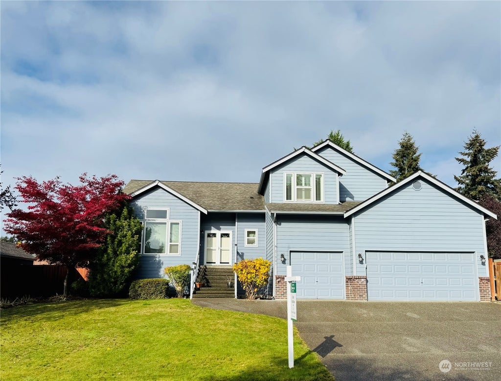 Bonney Lake area home is set with Mt. Rainier as the stunning backdrop. A large, eat-in kitchen with vaulted ceilings with a sunken, cozy living space with a gas fireplace. There is a large deck, private/fenced yard, jaccuzi, and a babbling brook that leads to a huge, private, community park. You can see into the yard from the kitchen, eating area, living room and primary bedroom. Upstairs, the primary bedroom features an ensuite with separate soaking tub and shower. There are two other bedrooms and a separate full bathroom on the second floor. Downstairs, there is a bedroom, bathroom, as well as a formal dining/sitting room. Work from home in the large, main floor office, just off of the kitchen.