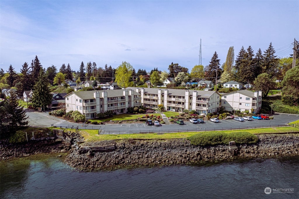 Top floor waterfront living in this freshly painted condo. Enjoy active views, watch boats & whales from your deck. Vaulted ceilings, gas fireplace, new carpet in bedrooms. Kitchen with breakfast bar add to an open floor plan in generous main living space. Two good sized bedrooms with full bath & half guest bath, oversized laundry room w/ storage space or could be a great work from home cubby! Cozy deck to take in the views. Add a few cosmetic updates to gain some sweat equity. Could be a great solution to keeping a NW footprint while living your snow bird dreams down south! Covered parking space. Wonderful location near Evergreen Park with trail & farmers market, restaurants & downtown, Just around the corner from OC, bus line & ferries.