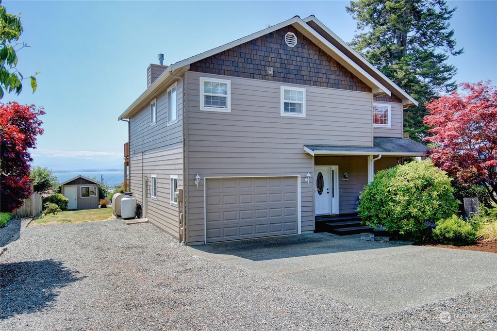 Discover your dream retreat in charming Admirals Cove! This stunning 2,088 sq ft home offers breathtaking bay views, perfect for serene living or a vacation getaway. Nestled on a 7,456 sq ft lot, this beach house-inspired gem features 3 spacious bedrooms & 3 baths. The 2nd-level primary suite, kitchen w/ eating space, & great room are designed to capture the panoramic view of the Olympic Mountains, the majestic scenery of the shipping lanes, and the Washington State Ferries. Cozy up to the inviting propane freestanding stove or enjoy outdoor living on the large deck. Previously a vacation rental, this home is ready to welcome you with its warm ambiance. Don't miss your chance to own this picturesque haven. NEW ROOF as of 9/20/24