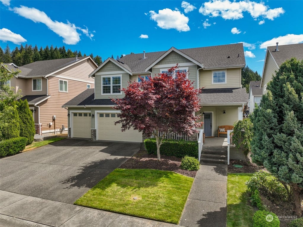 Charming Falling Water home w/4-car garage! Step inside from the Lg covered front porch to discover a well-maintained home w/thoughtfully designed floor plan w/wainscoting, crown molding & extensive hardwood floors that flow effortlessly throughout. Situated on a private lot, fully fenced w/sprinkler sys & extended patio/sports court! Gourmet kitchen offers SS steel appliances, double oven, full-height tile backsplash, pantry, granite w/island/breakfast bar! Office w/French doors on main, Retreat to Primary Suite overlooking backyard w/vaulted ceilings, 5-pc bath w/garden tub & Lg walk-in closet. 4 bdrms up & Lg BONUS rm/opt. 5th bdrm, upstairs laundry & loft area! Community parks & neighborhood events. Award-winning Sumner School District.