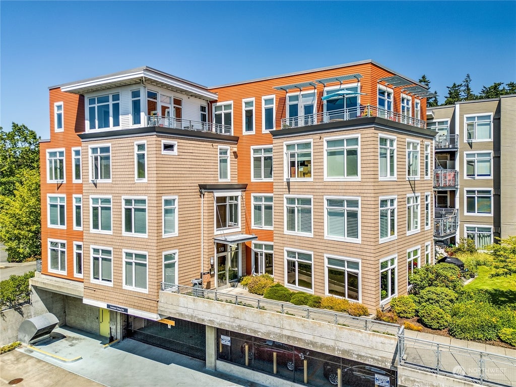 Coveted top floor 1 bedroom 1.5 bath condo steps from Seattle Ferry in vibrant downtown Bainbridge Island. Sunny, private and quiet unit features hardwood floors, new carpeting, granite countertops & cherry cabinets. Spacious ensuite bedroom has a large closet and bathroom. Elevator access to covered parking space below. Private deck off living room & bedroom with views to the North. High Speed WIFI included. Located close to excellent restaurants, classy boutiques, groceries, theatres & more. Complex amenities include library with pool table, clubhouse, gym, staffed lobby, a business center, and a guest rental unit, all surrounded by professionally landscaped grounds. A commuter's dream!