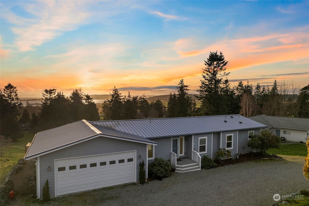 Enjoy this spacious, charming home on a large lot with Westerly views! This property features a metal roof, cement plank siding, a generous yard with a shed, chicken coop, garden space, ample parking, and two garages. Inside, the open-concept main floor boasts a large living area and kitchen with a spacious island, custom cabinets, updated appliances, and a built-in wine cooler, plus a guest bath. Heated luxury vinyl plank floors extend to a guest room and a main suite with a walk-in closet and custom five-piece bath. Relax on the updated Trex deck with views of the Olympics and ferries. The lower level includes a spacious living area, laundry, half bath, office, and extra garage/shop space!