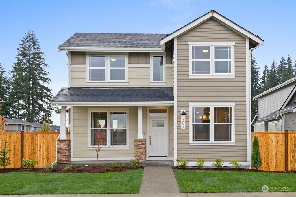 Rob Rice Homes new construction Elm Plan in Skyview Estates offers the ideal easy living experience! The kitchen boasts elegant 'Cocoa' Maple cabinets, quartz counters, a full tile backsplash, and stainless steel appliances. It seamlessly connects to a living room with a cozy gas fireplace and luxury engineered hardwood throughout the main floor. Upstairs, you'll find a loft and all the bedrooms, including a primary suite featuring a walk-in closet, 5 pc. bath with quartz counter tops, tile floors and a soaking tub. The contemporary finishes and meticulous attention to detail are evident throughout. Oversized 2-car garage, a spacious partially covered side patio, and front yard irrigated & maintained by the HOA.