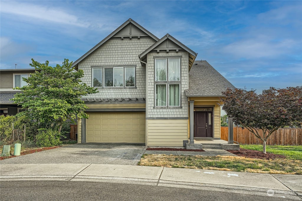 Two story home on a quiet cul de sac. Spacious entry with soaring ceilings and an open spindle rail staircase. Stylish kitchen with light quartz counters over dark cabinets and white subway tile backsplash, huge center island, stainless steel appliances including brand new range oven and microwave range hood, gas cooktop. Generous sized family room with a gas fireplace adjoins the kitchen. Primary suite features a walk-in closet and a five-piece bath with a soaking tub. Functional upstairs bonus room between the bedrooms. Convenient upstairs laundry room with a laundry sink, cabinets and a folding counter. Central A/C keeps it cool. Fresh interior paint makes it move-in ready. Level lot with a large, fenced yard. Community park.