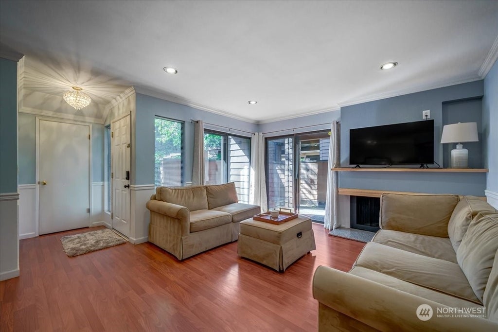 Terrific Totem Lake - Country Trace condo, ground floor end unit ideally located near the amazing Village at Totem Lake. This cozy private 1 bed condo features a bright open flr plan w/ 2 sliders in the living rm, wd burning frplc, lg dining area connecting to the kit (all appliances included). The sliders open to a private patio great for BBQing & entertaining. The primary suite has a full bath w/ dbl vanity & walk-in closet. The condo has an assigned cvrd prkg space w/ storage & no rental cap. Enjoy sunny days out at the pool, or soak in the clubhouse hot tub after a long day at work, head over to The Village to see a movie, get a great meal at one of the numerous restaurants, get a coffee & relax, or go shopping. You'll love this condo!