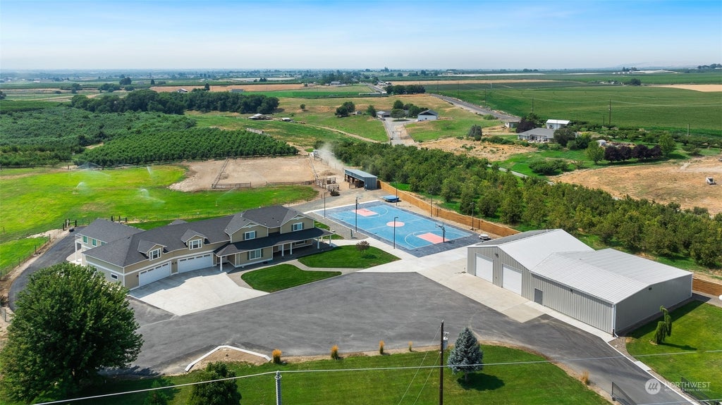 Live your dream in Yakima Valley Wine Country! Nestled in the Rattlesnake Hills AVA, this beautifully designed 5,466 sq ft home offers room to roam and stunning Mt. Adams Views. Perfect for entertaining and multi-generational living, this eco-friendly home features 3 ensuites (one on the main level), 2 additional bedrooms, home schooling/office/craft room, family/game room, and an office with golf simulator capacity. Enjoy peace of mind with a security system, an attached 4-car garage with Tesla charger, and a gated and fenced property. The home includes 40 solar panels, 4,440 sq ft heated shop, indoor RV parking, a full-size lighted sports court, putting green, and horse/livestock setup. Set on 5.5 acres, this is a tremendous opportunity.