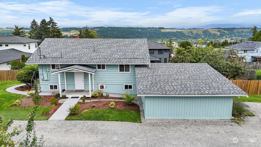 A RARE opportunity to own the perfect house nestled in among million dollar homes with no HOA! Large lot is fenced and fully landscaped, offers incredible MT Rainier view and the surrounding territory. You have a traditional split level with your main living upstairs; including large kitchen, living room, dining room, primary bedroom and full bathroom. Down stairs offers a bonus room, 2 bedrooms, full bathroom, utility room, and an office/den are that offers a closet for storage plus a large sliding glass door taking you out to the backyard that is fenced! There is a 484 sq ft enclosed storage area that could be easily be remodeled into a garage. Heat pump with AC and roof are only 4 years old per seller! Don't miss out on this one!