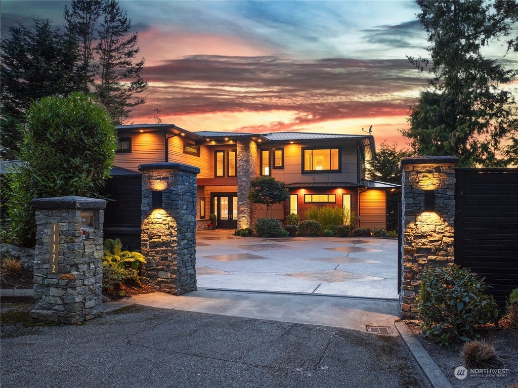 Unparalleled luxury in this exquisite high-bank waterfront estate, perfectly positioned to capture stunning sunsets. The grand entrance welcomes you with an open staircase, catwalk, & two-story living room adorned with a breathtaking floor-to-ceiling stone fireplace. The gourmet kitchen features quartzite countertops, top-of-the-line Thermador appliances, & a butler's pantry. Retreat to the spa-inspired primary bath, boasting a double-entry, multi-head shower, freestanding soaking tub, & radiant heated floors for ultimate relaxation. Lower level enjoys a theater room & rec room. Outdoor living is redefined with multiple decks & patios, including firepits for cozy gatherings. This home is the epitome of luxurious Pacific Northwest living.