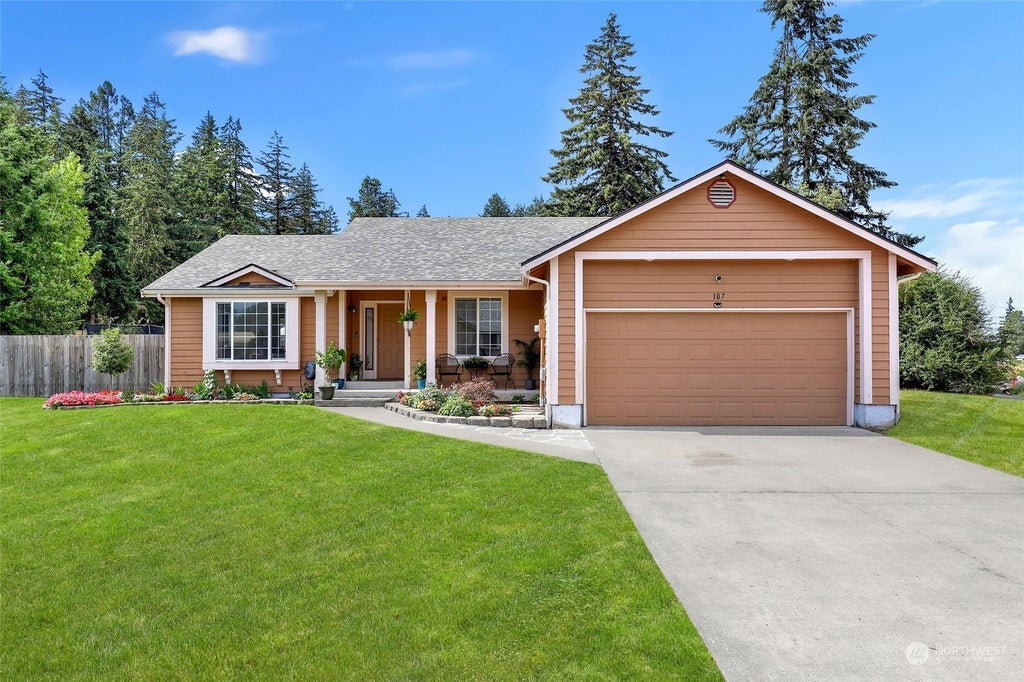 Nestled on over half an acre with Mount Rainier as a stunning backdrop, this meticulously maintained home is move-in ready. Bathed in natural light and thoughtfully designed for comfortable living, it features a spacious front living room with an open floor plan, a cozy wood-burning fireplace, and a second living area. The home offers three generously sized bedrooms, including a primary suite with a private 5-piece ensuite and walk-in closet. Recent updates include a brand new roof, newer hot water tank, updated appliances, and fresh carpeting. Enjoy outdoor living with a covered patio and 2 outbuildings for versatility, plus RV parking. Close to JBLM and all amenities... Welcome Home!