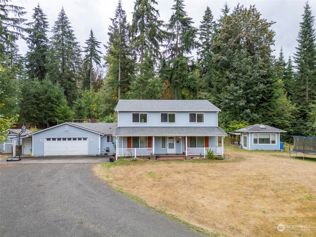 Discover tranquility on 5 private acres with this charming Craftsman home. The main level features a primary bedroom with a newly remodeled en-suite bath, complete with a floor-to-ceiling tiled walk-in shower, tile floors, and quartz counters. Enjoy a living room, family room, dining room, and updated kitchen—ideal for entertaining. Upstairs includes a spacious bonus area, 4 additional bedrooms, and a remodeled bath with a tiled shower, flooring, and quartz counters. Modern amenities include AC, a new roof, and a new heat pump. The property also boasts a covered front porch and a versatile studio for art, yoga, or workouts. Experience country living close to Tumwater and Tenino.