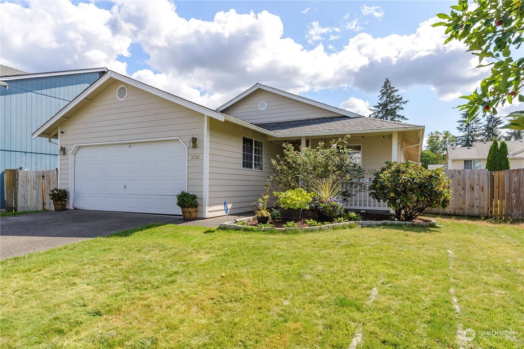 This cute spacious 3 bedroom, 2 bath Spanaway Rambler is situated in a quiet & quaint neighborhood. The open concept kitchen/dining/living area makes this home feel extra spacious. The corner fireplace, vaulted ceilings and slider off the main area directly to the back yard fills the home with plenty of natural light. Stylish kitchen boasts stainless appliances, plenty of cabinet space & bar seating. Primary suite features an en-suite full bath & a walk-in closet. Fully fenced backyard is ideal for entertaining and for those outdoor BBQ's. Fully fenced for extra privacy and even room to test your green thumb with room to add a garden. Close to schools and an easy commute to JBLM! Seller credit for complete new garage door, including tracks!