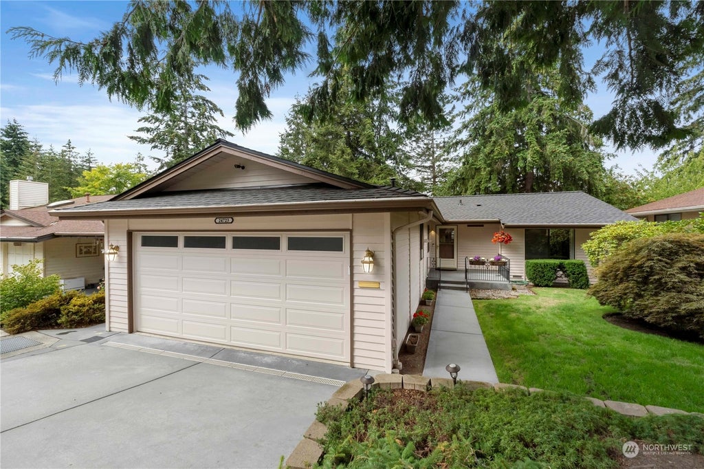 Beautiful, well-maintained single-level home in the highly sought-after community of Huntington Park. Light-filled open floorplan includes a bright, spacious kitchen w/recessed lighting, matching appliances, Corian counter tops, gas cooking, plenty of cabinetry, dining area & sunroom lead perfectly into expansive dining & living rooms w/attractive granite fireplace w/gas insert, skylights & slider access to large entertainment deck w/electric sunshade, gas hook-up & overlooks wonderful greenspace. Large primary suite w/double closets & attached bath. Brand new roof w/leaf gutter filters. Gas heating/cooling & tankless H2o. Hardwood floors. 2 car garage. Expansive storage under house. Lovely wooded lot w/gorgeous landscaping. Welcome Home!