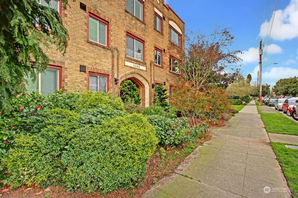 In a neighborhood setting, blocks from Lake Union, with preserved old-world charm, sits the Harmon Building with timeless brick exterior, impressive wood and glass entrance, surrounded by mature landscaping. The lobby with rich wood flooring and warm paneled walls, feels welcoming. Tastefully updated, this lovely first floor unit has refinished hardwood floors and new interior paint. Spacious living room with coved ceilings is illuminated with natural light from large front windows. Charming kitchen provides an eating nook, white cabinets, tiled countertops, and gas range. Remodeled bathroom feels fresh. Cozy extra room is ideal for home office, and the bedroom with walk-in closet, accommodates queen-sized bed, nightstands, and a dresser.