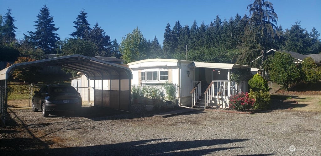 Nice remodeled Manufactured home on 18,500 square foot lot, fully fenced with gate, RV parking, room to grow, septic for 3 bedrooms and room for garden! Kitchen complete remodel in 2022 with quartz counters, vinyl plank floors and shaker cabinets and soft close drawers. Full bath complete remodeled by nicely. New plumbing Piping throughout the home. Living room off kitchen with new carpets in 2022, new paint inside throughout. Large 2 car canopy carport, storage sheds and one can be used for a shop. Tons of Parking