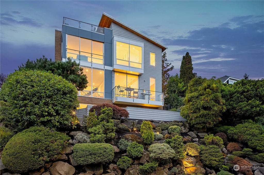 A bespoke work of architectural art set upon Magnolia's east ridge. Immense, yet intimate. Wide "24-hour entertaining views" of Mt Rainier, Cascades, Puget Sound, city & sunrise. Level entry from alley. Luxe primary suite w/vessel tub + two Jr. suites & laundry up. Main-floor bdrm (outfitted as office). Stunning kitchen w/butler's pantry & BQ balcony. Daylight guest bdrm, bath, media rm (w/yard access), storage (potential 2nd kitchen) down. $120K Cinematech screening room. Heated roof deck w/gas, elec, h/c water & Sonos. Warm walnut paneling/cabinets. 9.5' ceilings w/automated window shades. Openable Fleetwood glass panel walls. A/C. Sonos. $300K+ in upgrades (incl. new Hardie siding system, paint, sewer). Two garages (1 w/EV charger svc).