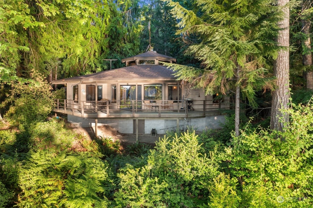 Come home to serenity. This house is set high among the trees w/expansive views of Puget Sound and the Olympic Mts. A one-level octagonal home, built with mid-century materials, the house retains those original vibes. A sunken living room with NW tribal decor faces a towering stone fireplace. Imagine morning coffee on the large covered deck & evening BBQ's watching the sun set over the sound/mts. Hear the calls of seals, catch sight of Orcas, enjoy the company of wildlife around you in the woods. With high open ceilings relax with the NW rains. The property is in Hartstene Pointe, a HOA. Among HP amenities: miles of walking trails, saltwater beaches. clubhouse, pool, marina, tennis/sport court, safety patrol and gated entry.