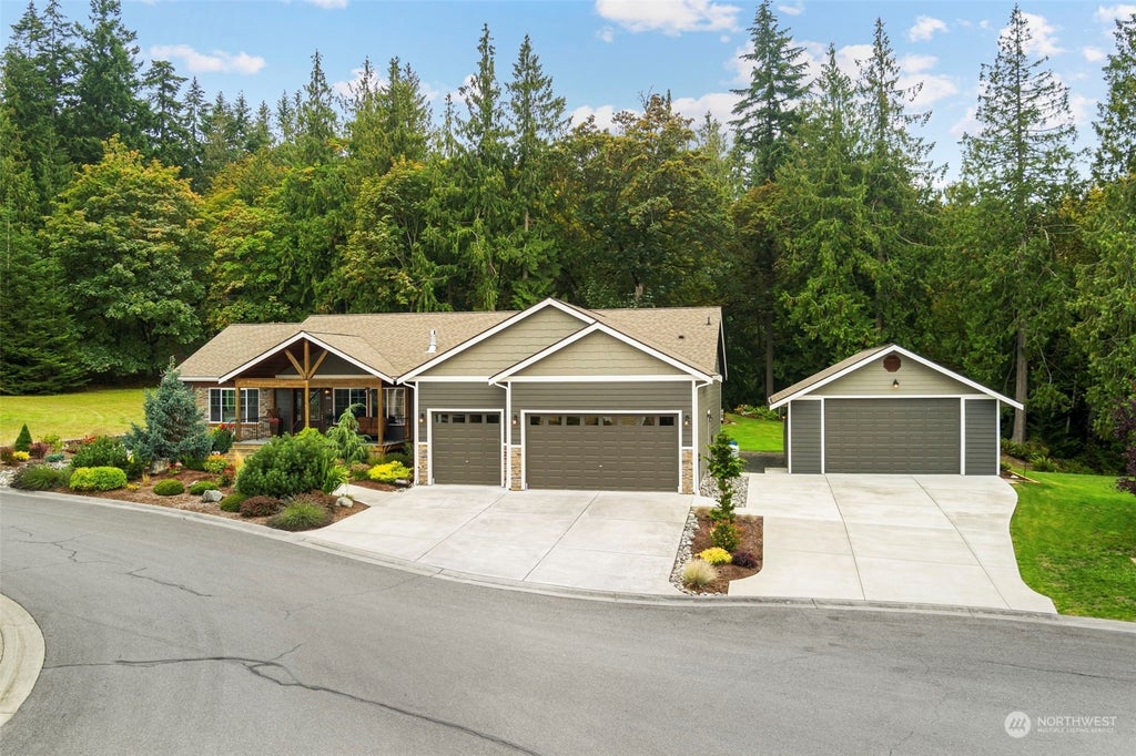 Beautiful 2015 remodeled home and stunning landscaping in Cedarbrook Estates has views of the straits from your living room and protection island from your bedroom. Just minutes from downtown yet tucked away on a cul-de-sac with 1+ acres. Remodeled front deck to sit and enjoy the ships out in the straits. 2 back porches and deck looking into your serene yard with a private path down to the creek. Remodeled kitchen with quartz countertops and Cafe stainless steel appliances and large island with wine fridge. Walk in pantry. Primary bedroom en suite with beautifully tiled shower and walk in closet. 3 bedrooms plus a den or office with sliding doors out to a deck. Remodeled detached garage with raised roof. This loved home could be yours.